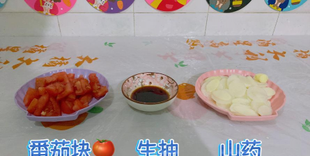 准备食材山药去皮切片或刨丝,用清水浸泡防止氧化变黑;西红柿切块备用。