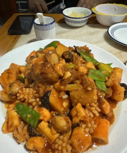 先放入易熟的蔬菜(如豆芽),再加入海鲜和豆腐。 - 用大火翻炒均匀,加入生抽、老抽、蚝油调味。3. 勾芡收汁