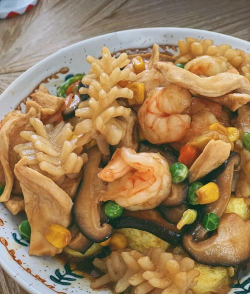 二、食材处理肉类处理鸡胸肉切丁后用盐、胡椒粉、料酒抓匀,裹淀粉炸至金黄酥脆备用。 - 海鲜类(虾仁去线、鱿鱼切花刀、蟹肉棒切段)需焯水去腥,虾仁可加蛋清提鲜。2. 豆腐处理