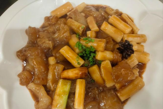 - 锅中加油爆香姜葱,加入牛蹄筋翻炒至微黄,再倒入料酒去腥。