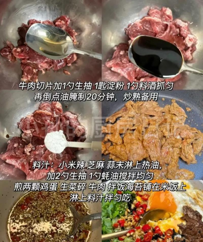 - 热锅凉油,先炒牛肉至变色断生,盛出备用。 - 加入胡萝卜丝翻炒至断生,再加入山药块继续翻炒。 - 倒入腌好的牛肉,调入生抽、老抽、蚝油,翻炒均匀。4. 调味收汁:加适量水或高汤,大火烧开后转中小火炖煮10-15分钟,至汤汁浓稠,山药绵软。5. 搭配米饭:将炒好的牛肉山药盛出,摆放在米饭上,可撒上葱花或香菜提香。