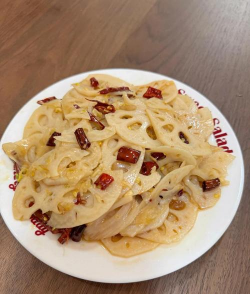 # 2. 花椒油版本炒香花椒后,加入芝麻油、豆瓣酱,调成麻辣味汁,拌入藕片。