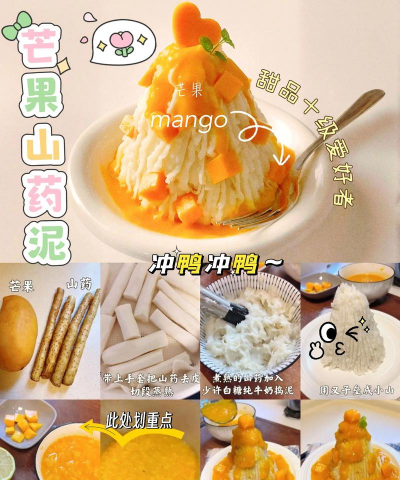 - 将蒸熟的山药泥与芒果丁/泥混合,加入黄油、糖、柠檬汁(可选)和蜂蜜/白砂糖调味
