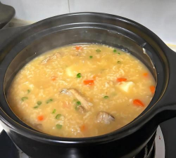 - 加入浸泡好的大米,继续小火煮20-30分钟,期间需搅拌防止粘锅。