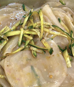 - 豆芽焯水后过凉,山药粉皮切丝焯水备用。
