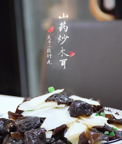 - 倒入焯水后的山药和木耳,翻炒2-3分钟;