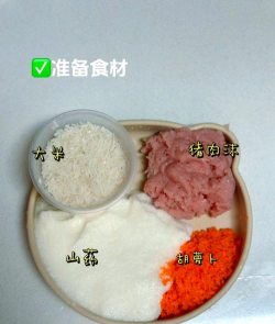 主料:大米100-150克、猪肉50-100克(建议选用里脊肉或瘦猪肉)、山药100-150克