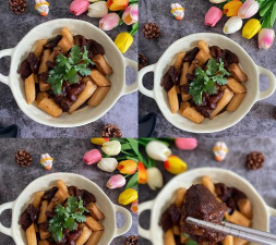 - 将焖煮好的牛筋山药盛出装盘,可根据喜好撒上葱花或香菜点缀。