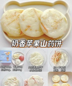山药糯米饼: 蒸熟的山药捣泥后加红枣碎、糯米粉,制成湿润面团; 苹果山药酥饼