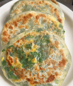 - 热锅冷油,舀入适量面糊摊成圆形饼状(直径约6-8寸)。