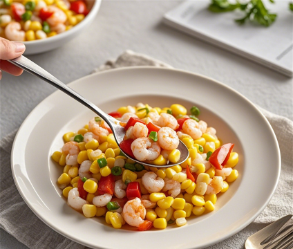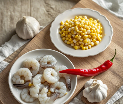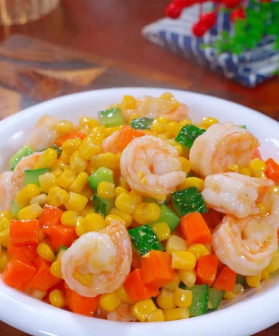 虾仁炒制:热锅冷油,油温7成热时下入虾仁,快速翻炒至变色后盛出,保持鲜嫩口感。- 山药炒制:同一锅中加油爆香葱姜,先下山药片翻炒1-2分钟,加入少量水焖煮至半透明,防止过软。- 混合翻炒:先炒虾仁至变色,再加入玉米和山药,调入生抽、盐、白胡椒粉,翻炒均匀后勾芡收汁。#### 3. 完成与装盘