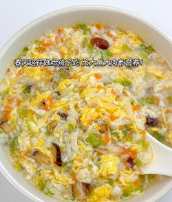- 在基础山药粥中加入胡萝卜丁、鸡蛋,煮至软糯后淋香菜提味。