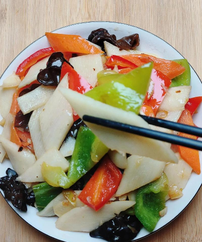 加入生抽、老抽、盐和白糖,翻炒均匀。- 倒入适量清水(约200ml),大火煮开后转小火收汁,期间需不断翻炒防止粘锅。- 最后加入青椒/红椒片,翻炒至断生即可出锅。