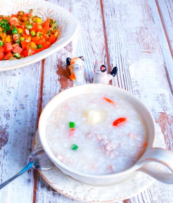 - 大米加水煮沸后转小火,加入炒好的肉末和山药泥;