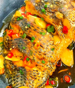 处理鱼 :去鳞、去鳃、去内脏,划几刀便于入味,用盐、料酒、姜片腌制15-20分钟。煎鱼:热锅凉油,小火慢煎至两面金黄,盛出备用。