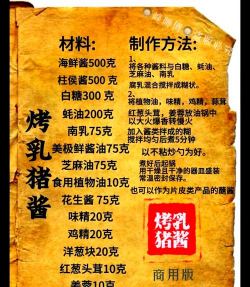酱香乳猪: 在腌料中加入甜面酱、腐乳,烤后淋上烧鹅酱 蜜糖乳猪