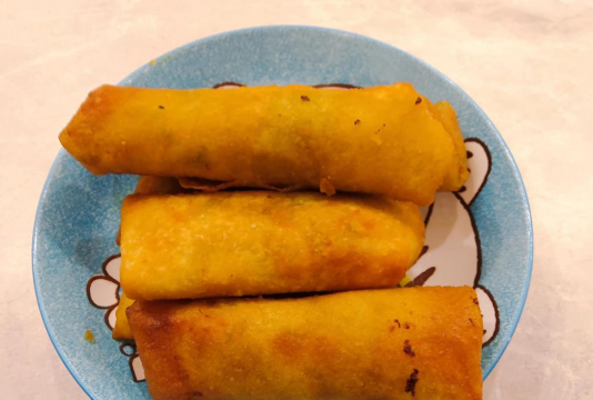 馅料调制:肉末加葱姜末、生抽、淀粉腌制,与胡萝卜丝、豆沙馅混合翻炒。2. 包制与炸制:春卷皮包入馅料,裹蛋液油炸至金黄酥脆。