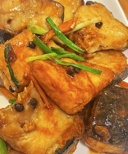- 鱼块上淋酱汁,撒香菜、葱花、芝麻,可搭配土豆片、豆芽等蔬菜增加口感。