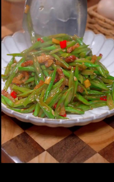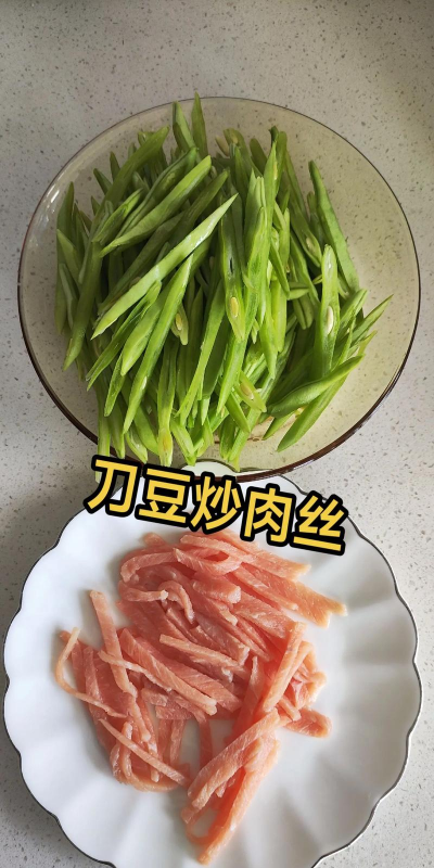 - 锅中放油,煸炒肉丝至变色后加入刀豆丝翻炒。