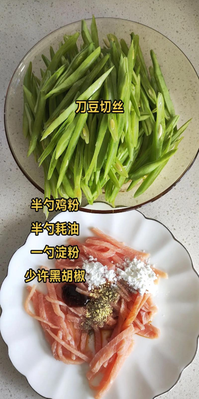 准备食材- 刀豆斜刀切丝,焯水1分钟后捞出过凉备用。