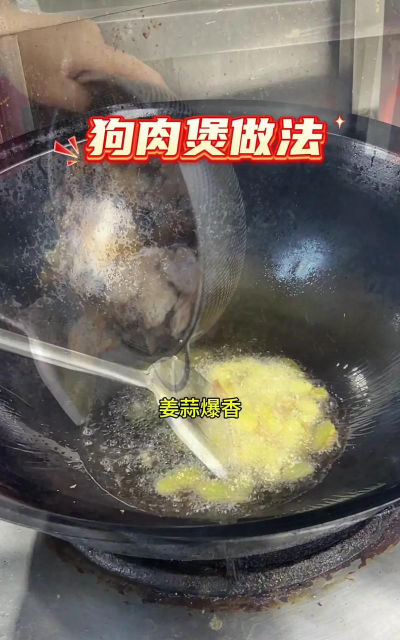 - 狗肉片煸炒至变色,加入干辣椒、花椒炒香。 - 放入姜蒜、葱段、料酒、生抽、老抽翻炒,最后大火收汁,撒上芝麻油。