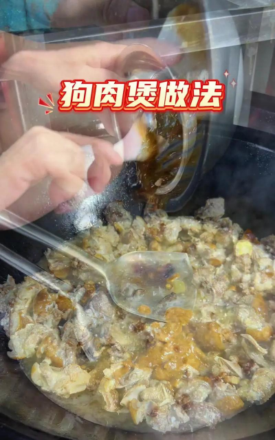 - 狗肉焯水后煸炒至变色,加入黄酒、生抽、老抽、糖调味。 - 放入桂皮、花椒、姜蒜炒香,加水炖煮2小时左右,至肉质酥烂。 - 最后收汁浓稠,撒上葱花即可。