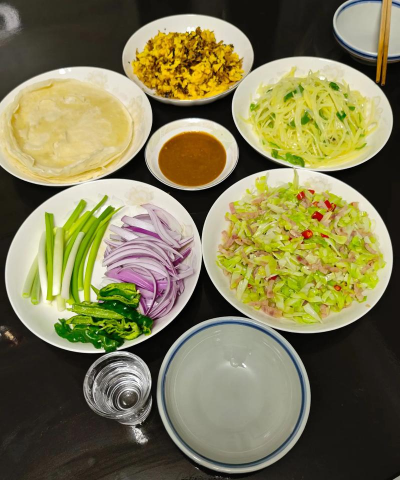 2. 炒菜时在饼上放鸡蛋液,加入火腿肠、生菜等翻炒,最后卷起食用。