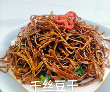 - 将焯水后的豆腐丝和板筋放入酱汁中,充分搅拌均匀后装盘