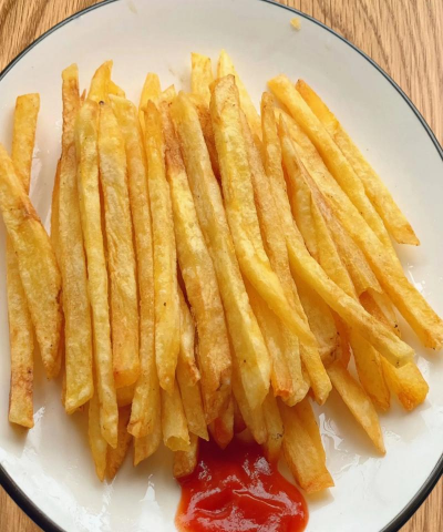 - 捞出炸好的薯条,沥干油分后装入盘中,撒上适量盐和黑胡椒粉(可选),搭配番茄酱食用。