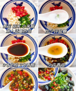 1. 蒜末与生抽、米醋、香油混合,加入白糖提鲜。2. 放入小米辣圈翻炒出香味,淋在皮蛋上,撒上葱花。