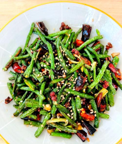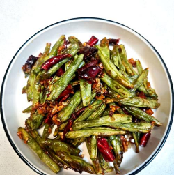 炒锅热油,爆香蒜末,加入豆角翻炒。 - 调入生抽、盐、糖,翻炒均匀后出锅。