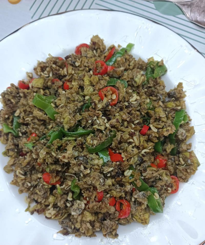 处理蚕肉:按需挤去脏物,剁碎后用盐、生抽、花椒面腌制15分钟。2. 炒制:热锅冷油,先炒蚕肉至变色干酥,再倒入鸡蛋液快速翻炒。3. 调味:加入辣椒油、葱花、蒜末,翻炒均匀即可出锅。
