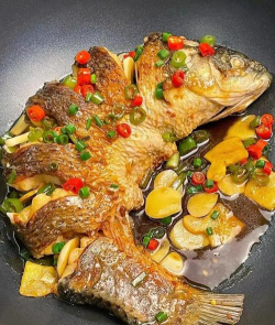 草鱼去鳞去内脏,背部划几刀便于入味,两面抹盐和料酒腌制15分钟。2. 煎鱼:平底锅热油,中小火煎至两面金黄,避免翻动过度。3. 炒香底料:另起锅炒香干辣椒、花椒、姜蒜、八角等香料。4. 调制酱汁:加入生抽、老抽、白糖、鸡精和清水熬制10分钟。5. 烤鱼与蔬菜结合:将鱼放入烤盘,浇上调料汁,铺上土豆、莲藕等蔬菜,烤至蔬菜变软且鱼身入味。