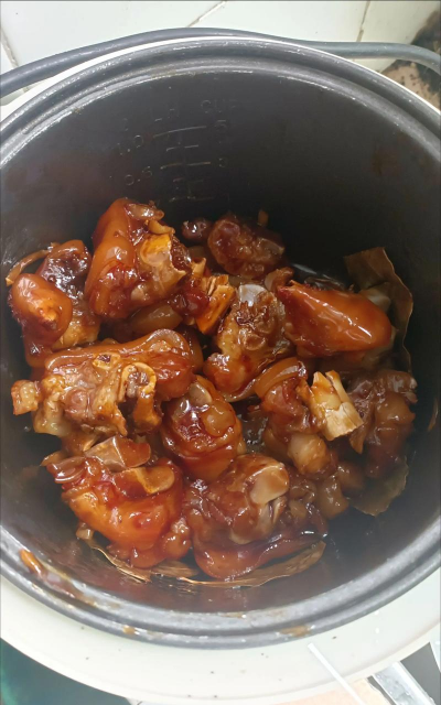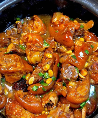 - 大火烧开后转小火炖1.5小时,至猪蹄软糯,汤汁浓稠