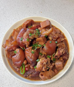 - 大火烧开后转小火慢炖1-1.5小时,至猪蹄软糯脱骨,汤汁浓稠