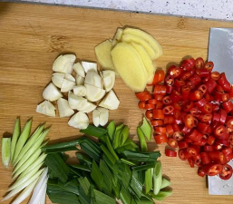 调味炒制:加入生抽、老抽、料酒,放入葱姜蒜爆香