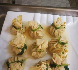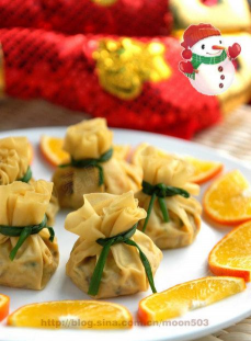 - 取白菜叶,将炒好的馅料包裹成半球形或钱袋状,用香菜梗系紧。4. 蒸煮与调味