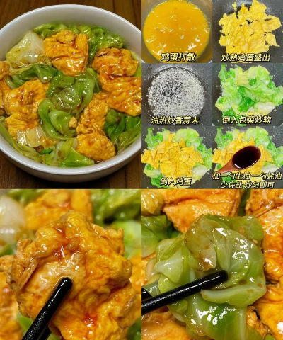 :1. 鸡蛋加盐料酒搅拌均匀,番茄切块备用。 2. 炒蛋至蓬松后盛出,炒番茄至出汁加糖提鲜。 3. 倒回鸡蛋翻炒均匀,收汁后装盘。2. 黄瓜火腿炒蛋