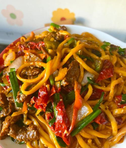 - 加入羊肉片翻炒至无水分,搭配番茄酱和红辣椒,最后加入煮面汤调味