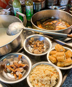 - 猪五花肉切块焯水后与骨汤(需提前熬煮1小时以上)混合,加入姜片、葱段炖煮1小时,最后加入米线煮熟