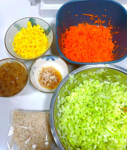 - 胡萝卜擦丝与芹菜碎(焯水后)混合,加入姜末、植物油、盐、胡椒粉,翻炒均匀。