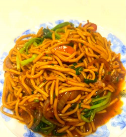 - 倒入炒面,加入卤汁翻炒至汤汁浓稠,面条裹满卤汁