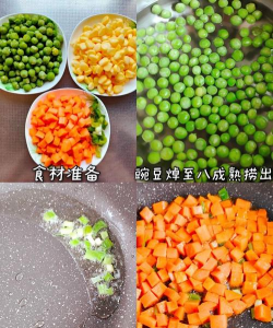 1. 蔬菜切小粒(胡萝卜、荷兰豆等易熟的先焯水保持翠绿);