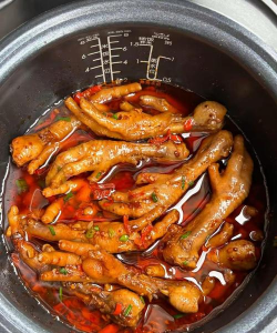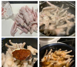 焯水:鸡爪剪去指甲,冷水下锅加料酒焯水去腥,捞出后过冷水备用。2. 腌制:鸡爪与葱姜末、花椒、干辣椒混合,加入生抽、老抽、料酒,搅拌均匀后腌制15分钟。3. 炖煮:电饭煲底刷油,铺上鸡爪,加入没过鸡爪的清水,放入八角、花椒,按下煮饭键。待跳至保温后,开盖搅拌均匀,再煮20-30分钟至鸡爪软烂。4. 调味收汁:根据口味调整盐量,开盖收汁至汤汁浓稠,鸡爪完全入味即可。