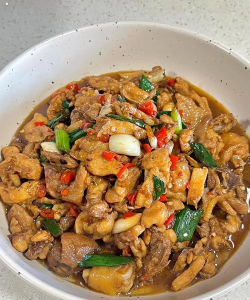 处理鸡肉:鸡块冷水下锅焯水,控干水分备用。2. 爆香锅底:热锅冷油,先加入猪油炒香,再加入山茶油和花椒爆香。3. 翻炒鸡肉:放入鸡块大火翻炒至表面焦黄,加入姜蒜末、辣椒翻炒均匀。4. 调味收汁:淋入生抽、老抽、蚝油,翻炒后加入少量白酒提香,小火焖10分钟至汤汁浓稠。