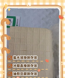 方法:将豆腐切成小块,放入淡盐水中浸泡,可以延长保存时间。