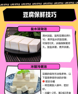 方法:将豆腐放入密封容器或保鲜袋中,加入少量清水或牛奶(可防止豆腐变干),然后放入冰箱冷藏。