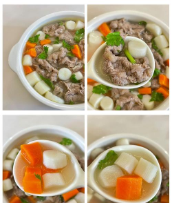 调味炖煮加入适量的盐、白胡椒粉,翻炒均匀。倒入适量的水,将水煮开后转小火炖煮10分钟左右,直到红萝卜变软。