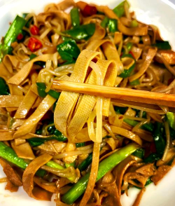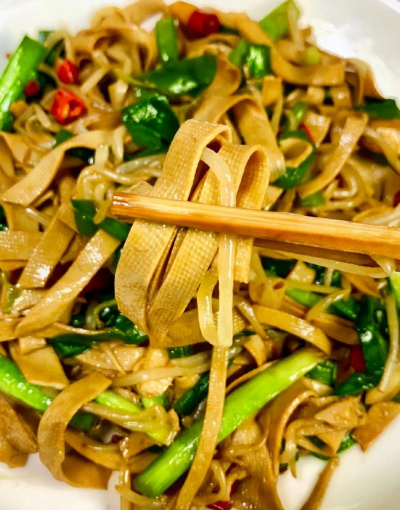 - 加入豆芽翻炒至断生,再放入豆腐皮。