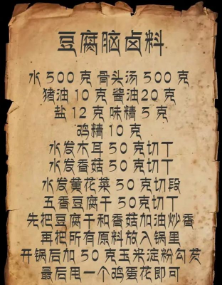 (北方风味):花椒粉1茶匙、八角粉30克、干辣椒段10克、生抽2汤匙、老抽1汤匙、蚝油1汤匙,可搭配鸡汤或清水熬煮。 二、甜口豆腐脑调料经典组合:红糖/白糖、糖浆、枸杞、椰浆、花生碎